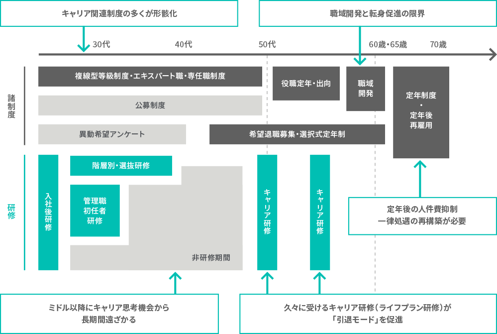 生産年齢人口の中核となるミドル・シニア層をどう活性化させるのか。課題を生まないための「予防」と課題を解決する「対処」を踏まえ、ここでは、ミドル・シニアの課題とその要因、そしてその中でポイントとなる3つの視点「キャリア自律」「職域の拡大と多様化」「人事制度・運用改革」についてご案内いたします。