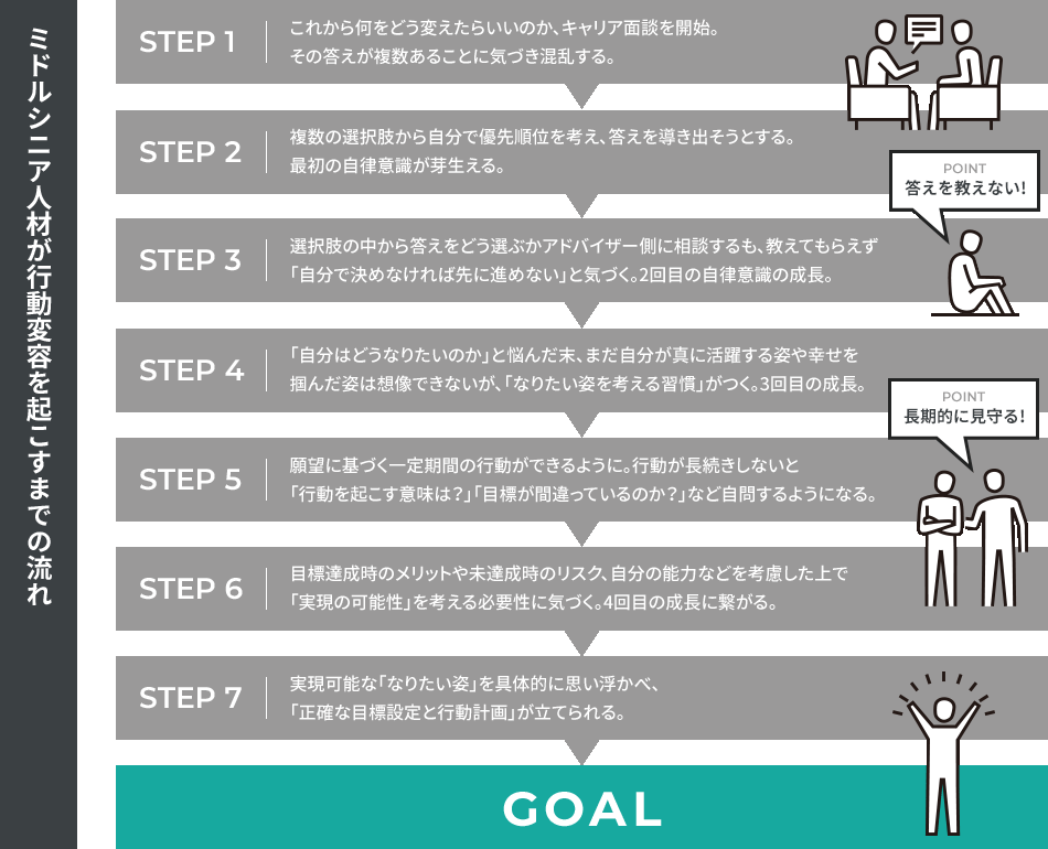 ミドルシニア人材に対して、行動変容やキャリア自律によって得られるメリットを提示することです。