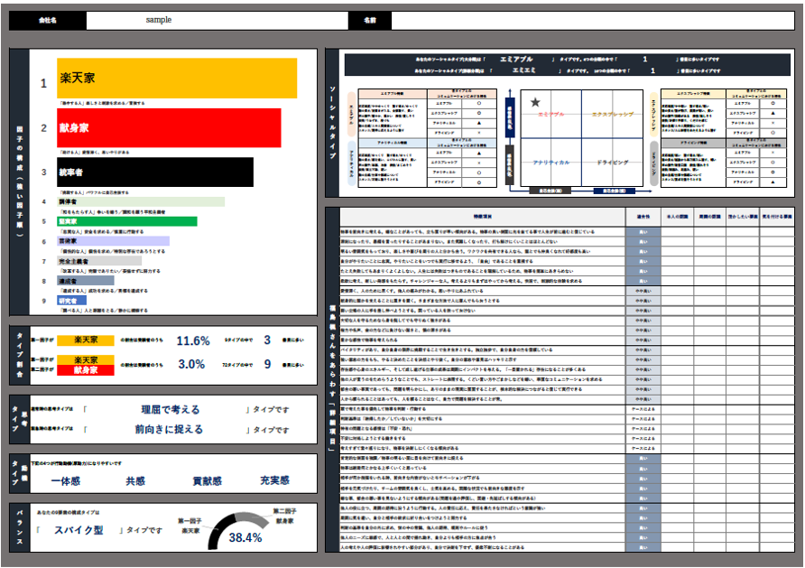 エニアグラムをベースとし、9つのタイプ別に基本的な資質(個性・人柄/指向/潜在能力)を測定。測定結果は、個人のキャリア自律促進、管理職のマネジメント力向上、組織の活性化に活用できます。